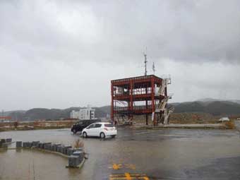 保存か解体かの結論が出ない防災対策庁舎は今もそのままで冷たい雨に打たれていた。