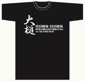 STANDING with THE STREET BEATSのロゴ。バックには「瓦礫の町で」の歌詞を力強くデザイン。ボディカラーは黒。皆様の思いを復興の力に!ご協力よろしくお願い致します!